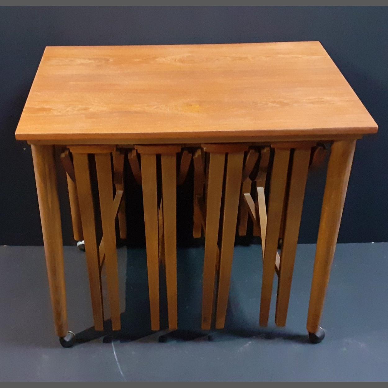 RETRO teak nest of tables set with four 'pull-out' tables on castors - dimensions of largest table 62cm width x 42cm depth x 56cm height approx