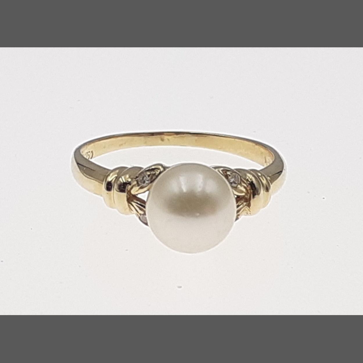 An 18ct / 750 stamped ring set with a lovely natural pearl. Size O, gross weight 3g approx.