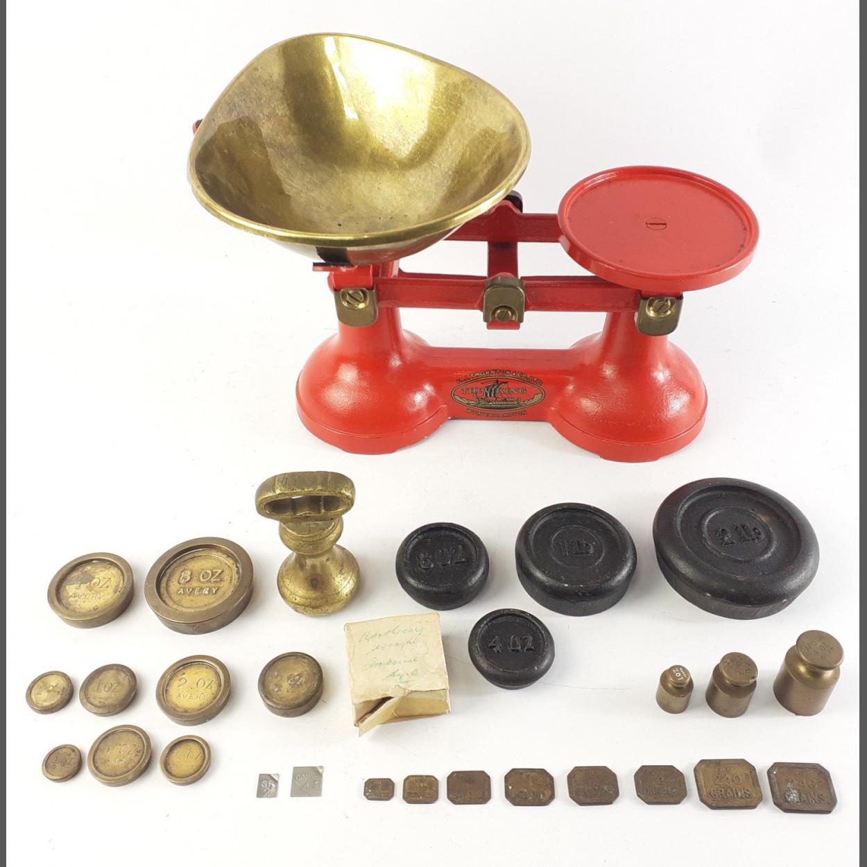A set of F.J. Thornton & Co. THE VIKING scales with a selection of weights. Red with good gilt graphics.