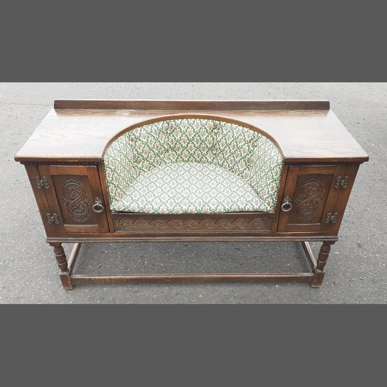 A demi-lune recessed charm seat with cupboard to sides 117cm x 43cm x 66cm approx. In good clean useable condition.