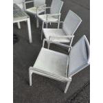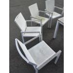 TOP QUALITY! SIX large metal framed garden stacking chairs in white with a matching wooden-topped square table and stylish parasol with weighted base