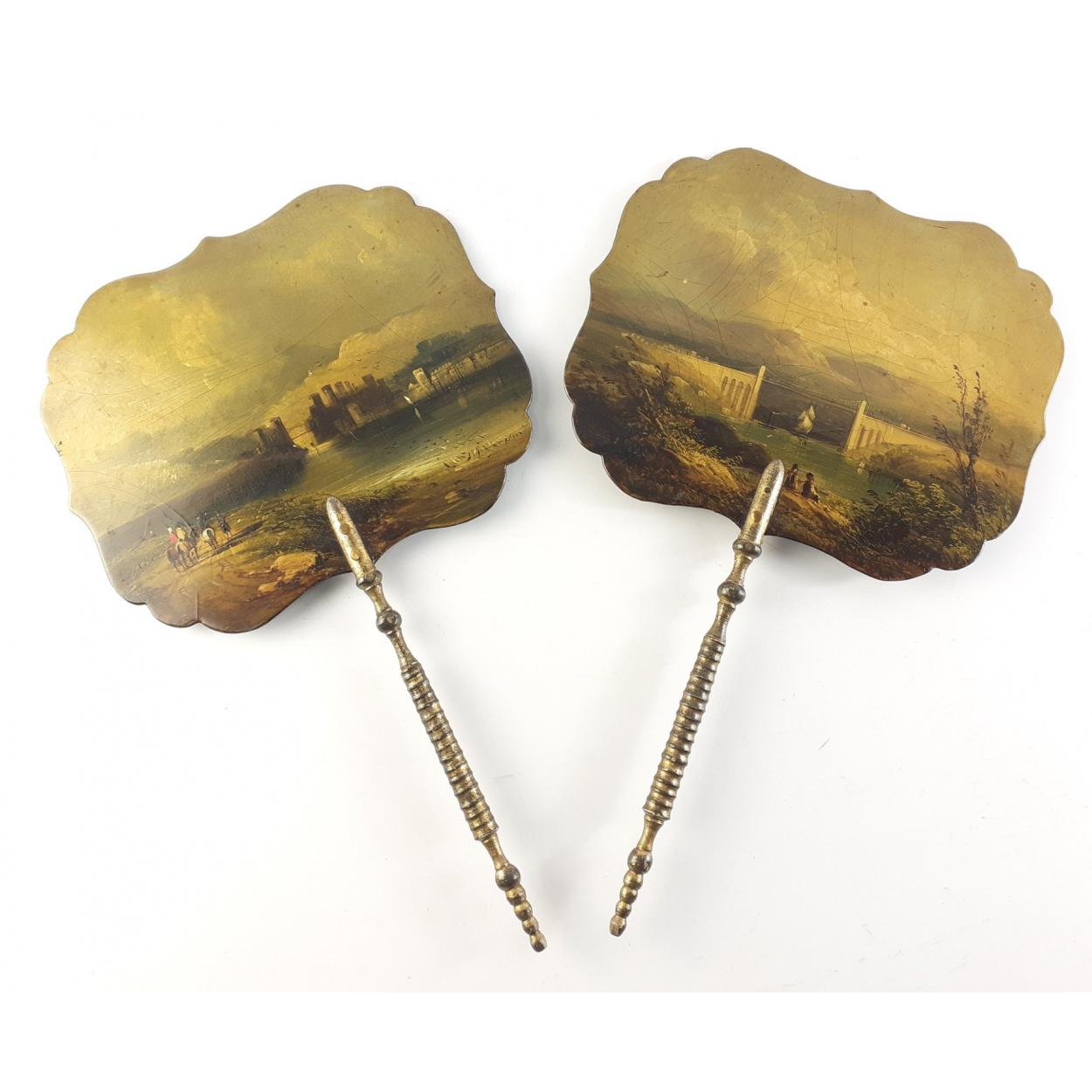 ANTIQUE - A pair of antique hand-held and hand-painted lacquer face / fire screens. Each 37cm long approx including handles