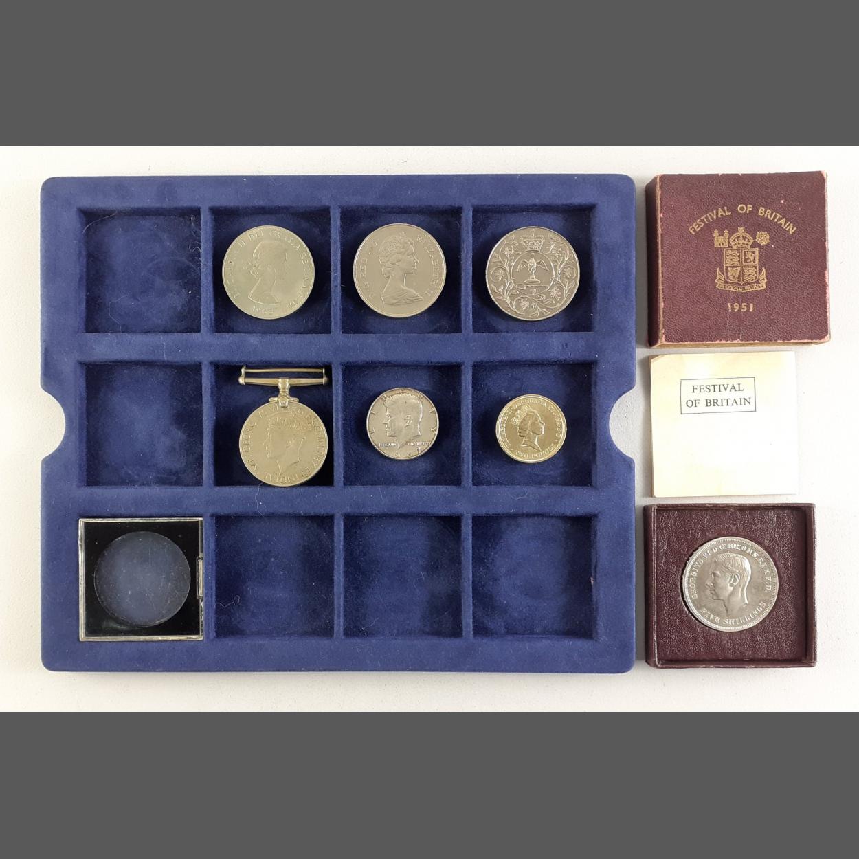 A coin tray containing three Crowns a £2 Bill of Rights, a WWII British War Medal, a 1951 Crown and a Kennedy Half.