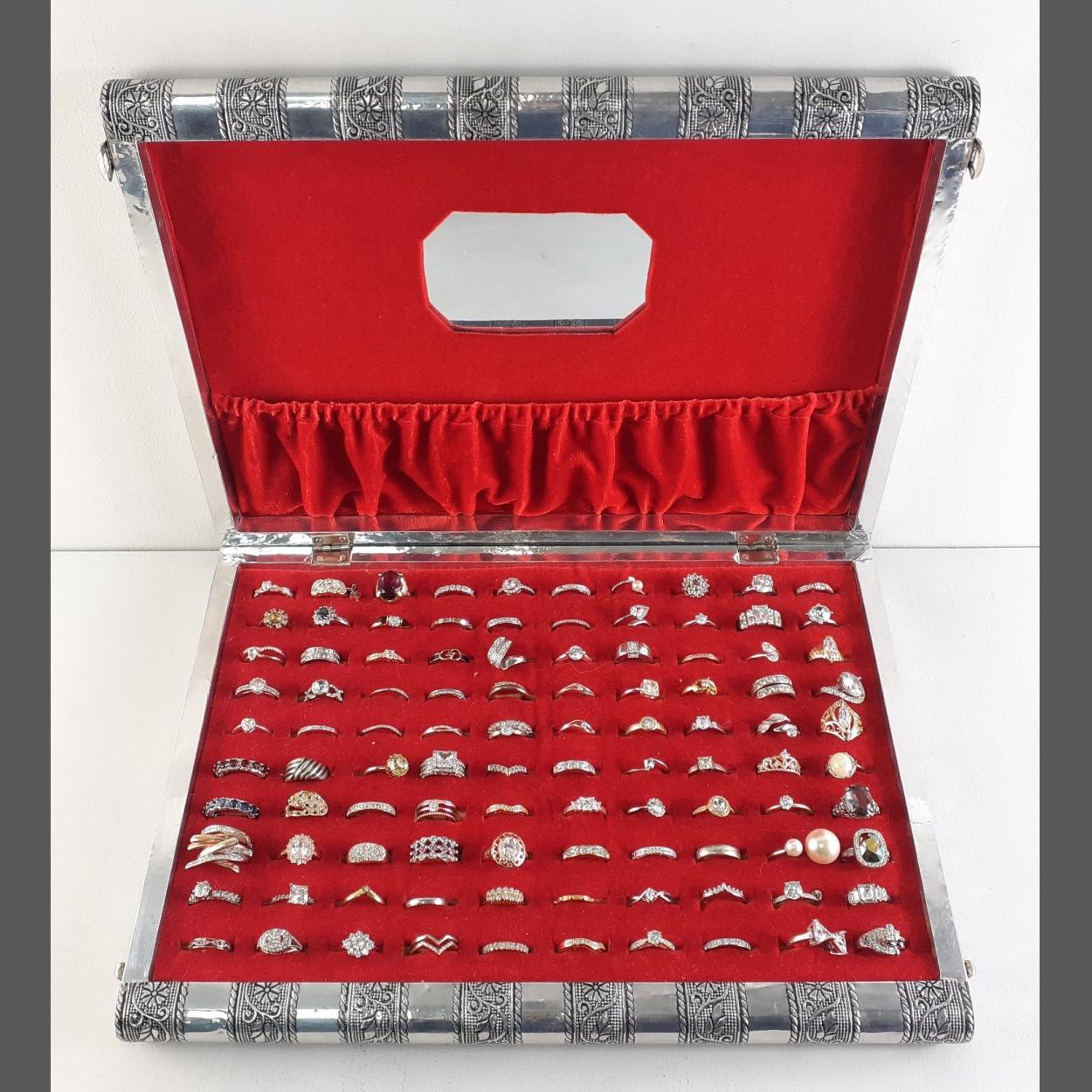 An ornate Indian style ring box with 100 dress rings. various sizes and designs. An amazing lot !!