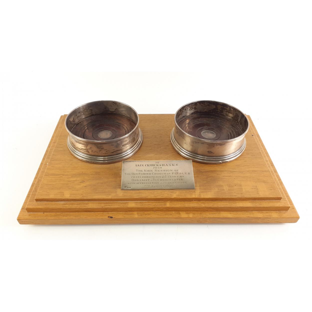 PEEBLES interest. A presentation plinth hallmarked wine coaster set. Dedicated to IAIN CRUICKSHANKS for 25 years service as Organist and Choirmaster at the Parish Kirk. Many a local worthy will remember Mr & Mrs Cruickshanks from their time at Peebles High School. The plinth measures 30cm x 20cm approx.