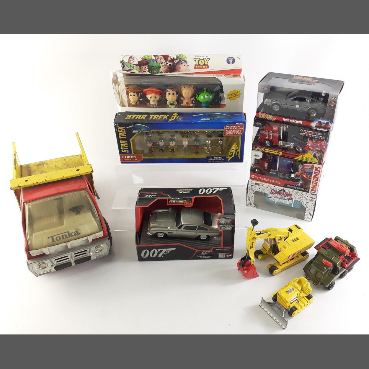 Mixed lot of toys to include TONKA tipper, boxed Back To The Future models, OO7, Scooby Doo van, Star Trek, Toy Story and others. Lots of interesting pieces,.