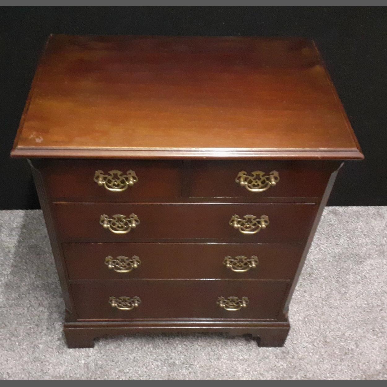 A campaign style 2 over 3 chest of drawers. Approx 67cm tall x 57cm wide x 37cm deep with brass fixtures. A lovely sturdy and useable piece.