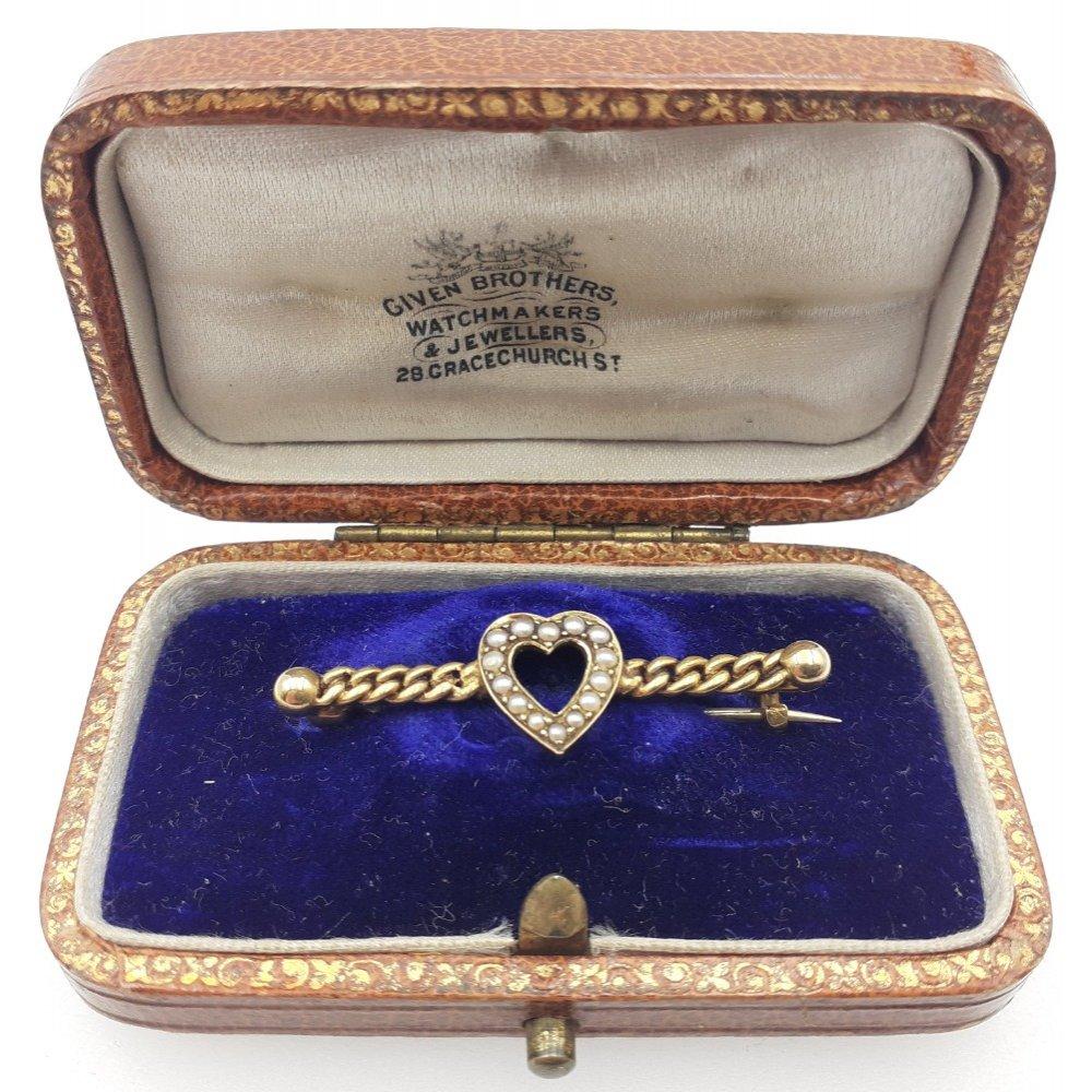 An 18ct stamped sweetheart bar brooch with seed pearls. 4cm long approx. Gross weight 2.85g approx. Presented in lovely jeweller's box.