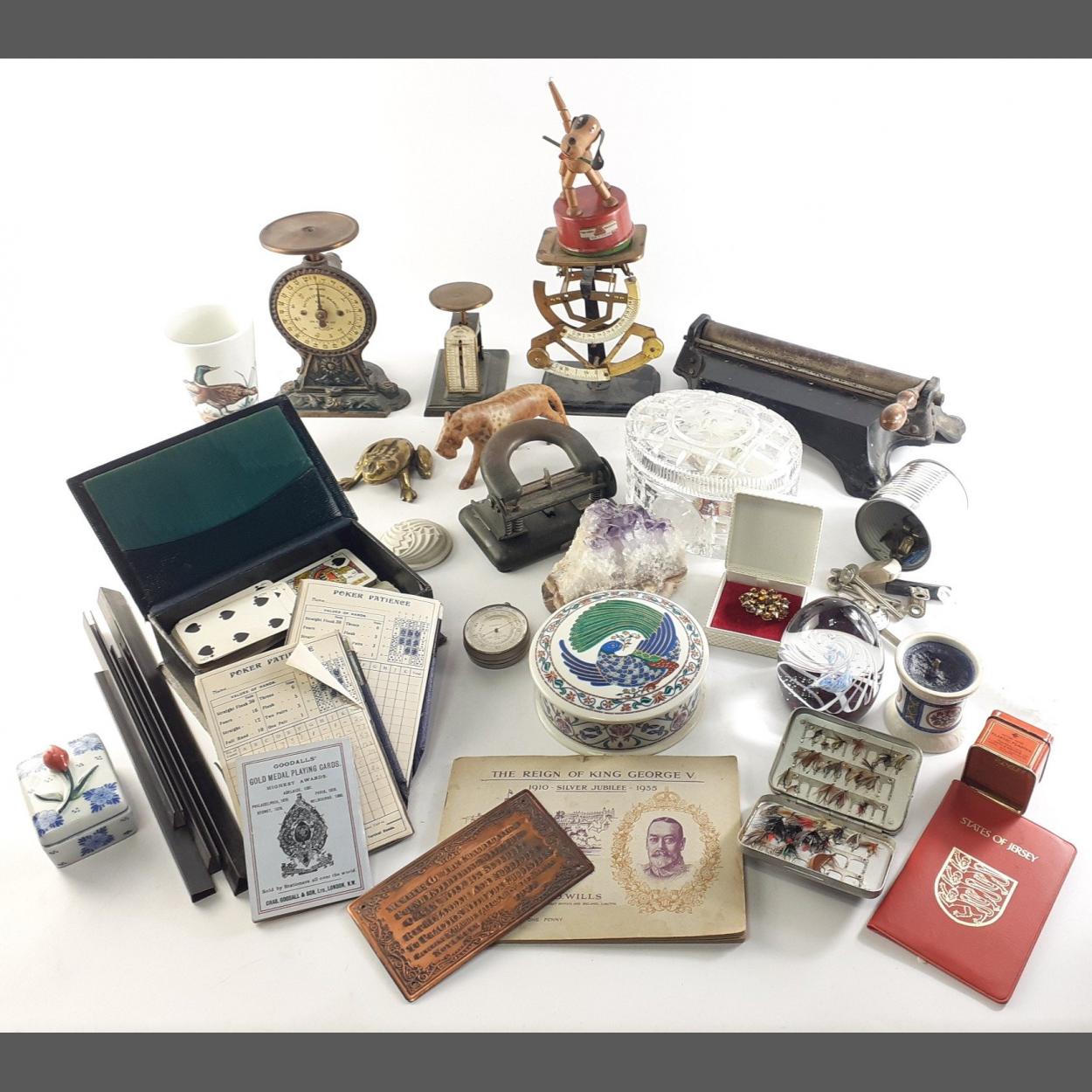 A mixed lot to include a SALTER'S letter balance, a set of bilateral scales, an amethyst geode, a SELKIRK GLASS paperweight, and ELIZABETH ARDEN Byzantium trinket box (12cm approx) and tealight etc.