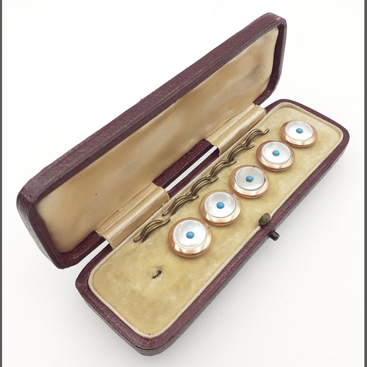 An attractive set of antique gentleman's studs in fitted case. Note one missing. Unmarked yellow metal with mother of pearl insets.