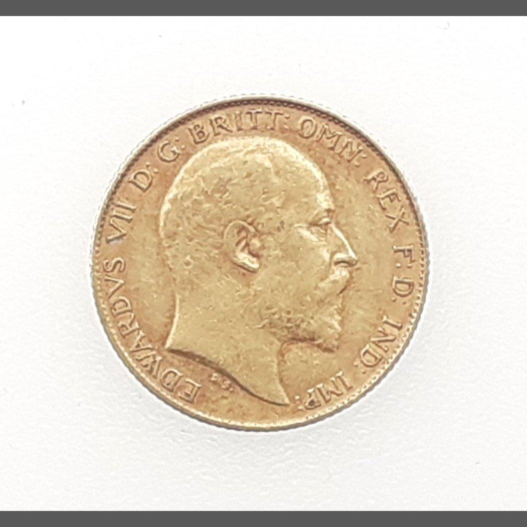 A 1908 Edward VII half sovereign with wear to high spots.