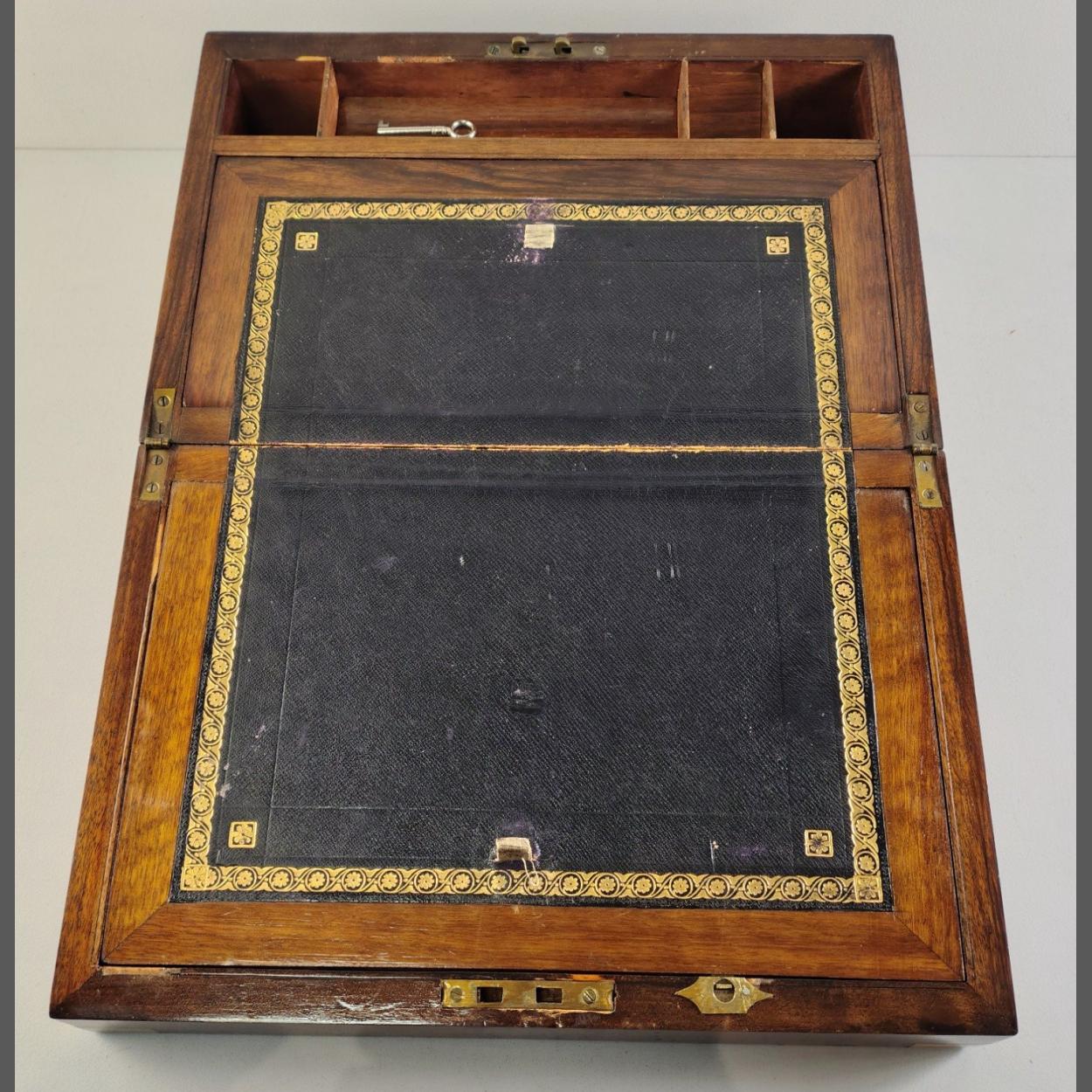 A nice quality writing slope with a black leather inlay, brass bound corners, 35 x 23 x 15cm approx. Comes with 2 keys. A lovely item.