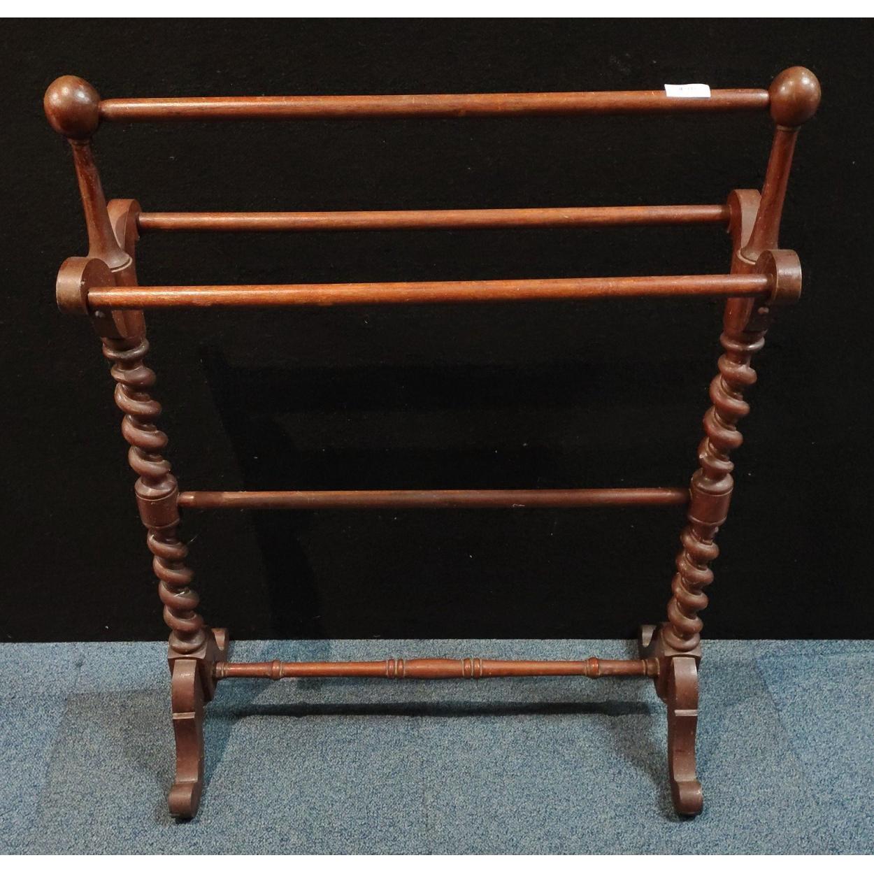 A vintage wooden towel rack with barley twist detail. Stands 88cm high approx