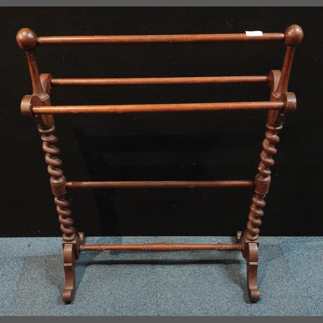 A vintage wooden towel rack with barley twist detail. Stands 88cm high approx
