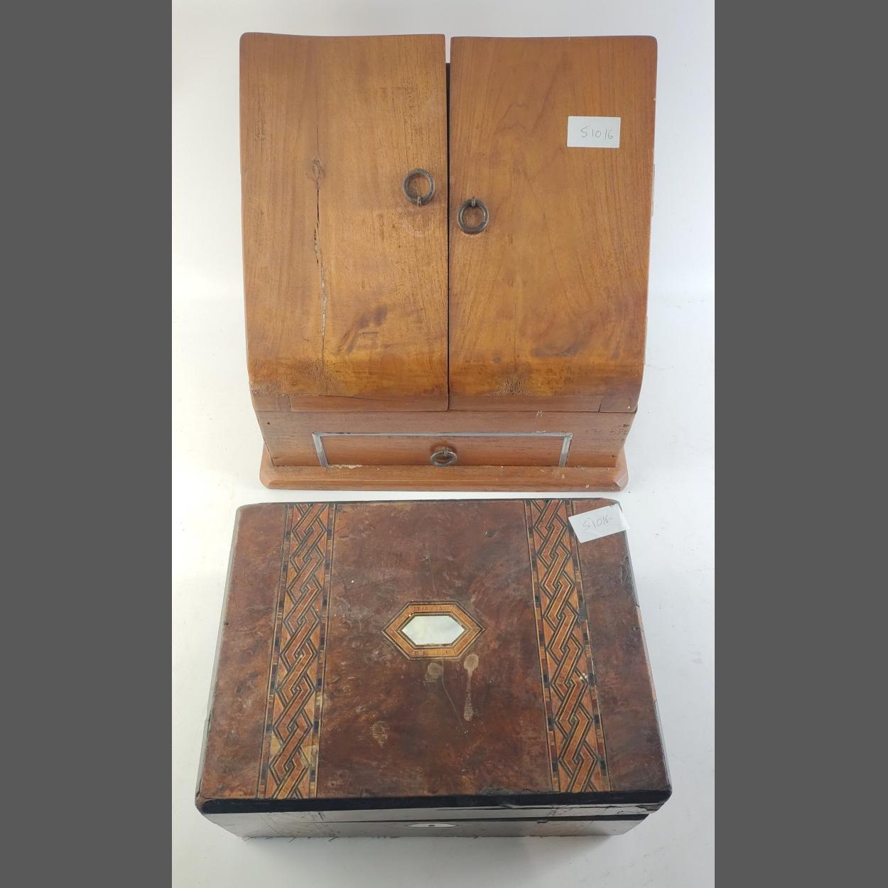 A VINTAGE wooden desk tidy 30 x 30 x 22cm approx. Has been partially restored, plus a wooden box with banded design and mother-of pearl inlay and a wooden mantlepiece clock which has been adapted to use a quartz battery