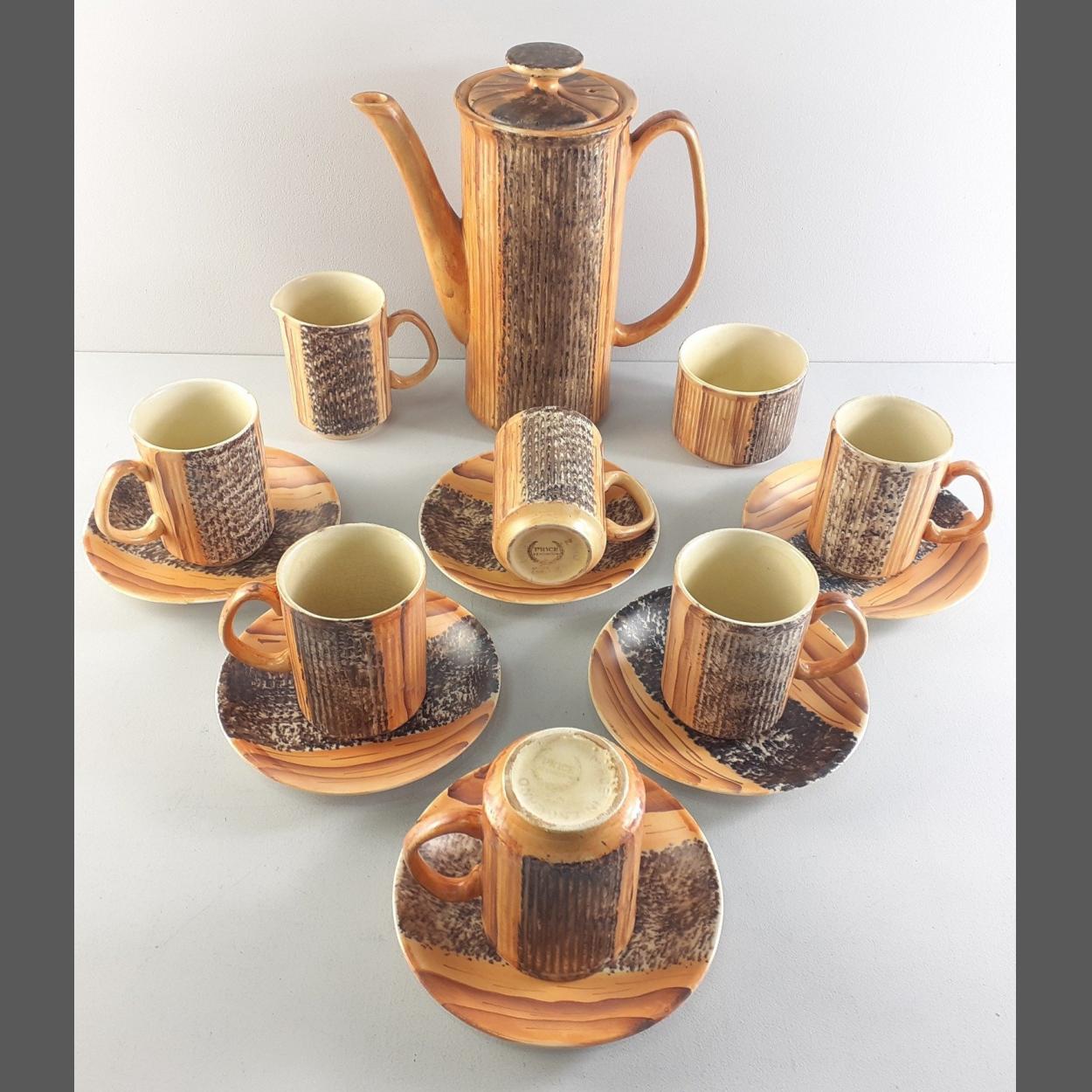 A retro PRICE KENSINGTON Phoenician brown textured wood effect retro coffee set consisting of 6 mugs, 6 saucers, 1 coffee pot, 1 milk and 1 sugar. One saucer damage repaired, small chip from 1 cup.