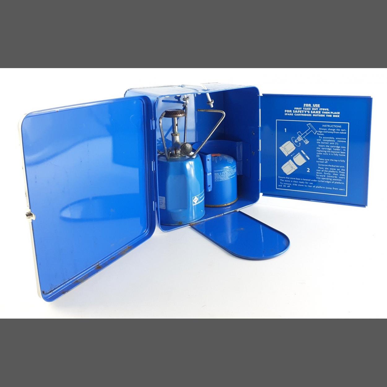A CAMPING GAZ International de luxe super bluet camping stove in a tin container. Comes with gas bottle.