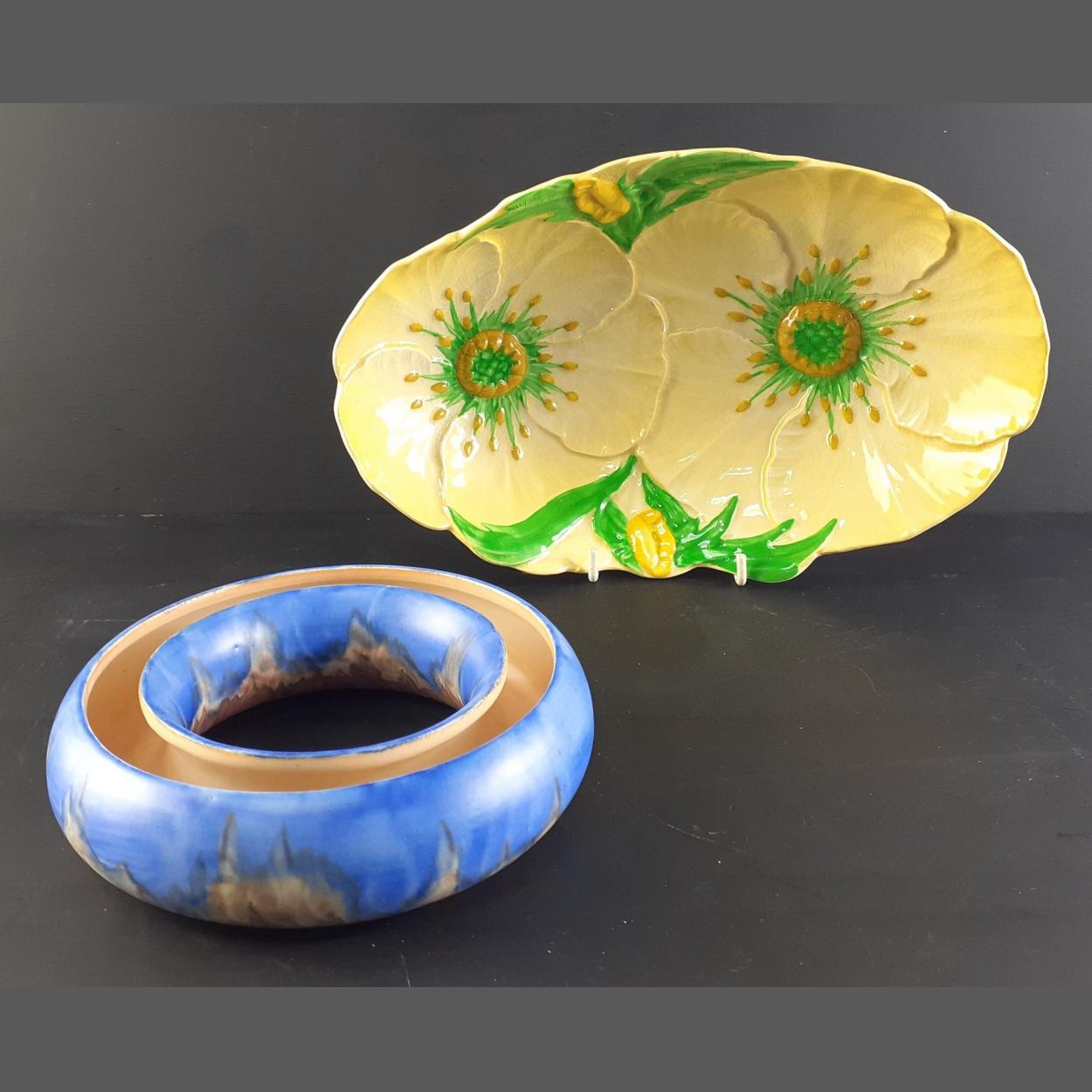 Two pieces of CARLTON WARE including a drip paint posy vase, 15cm diameter approx and a yellow pansy dish 17cm approx