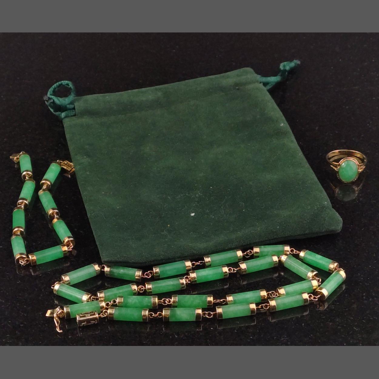 A 14K 585 stamped natural green marble jade suite of necklace, bracelet and ring. Ring size N, all pieces in clean well stored condition. Total gross weight 36g approx