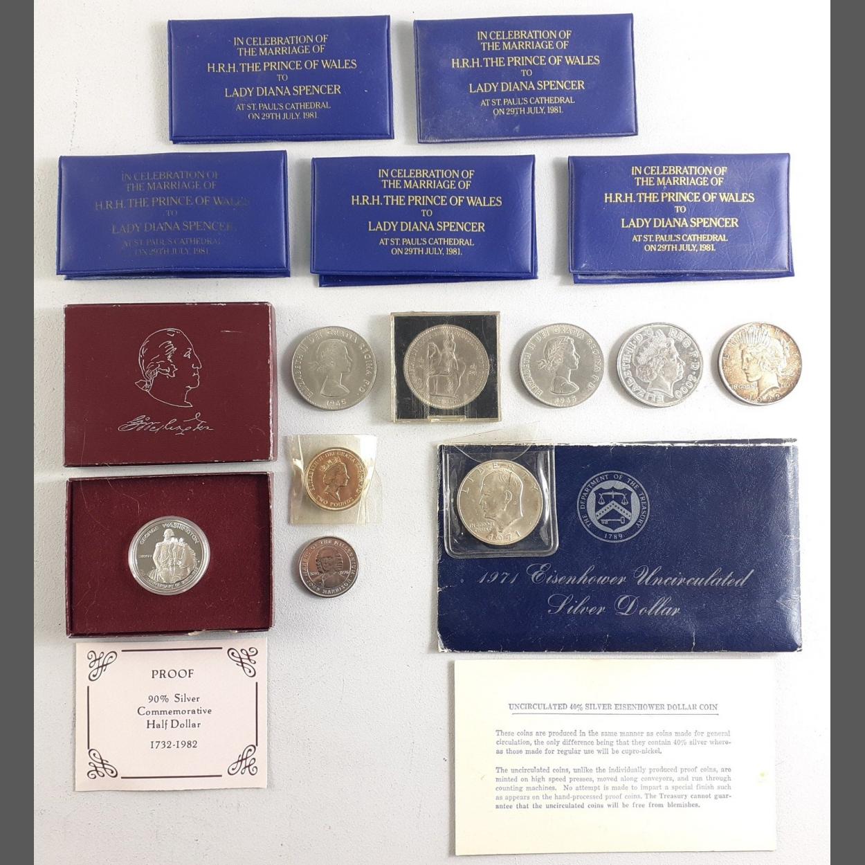 Small coin collection comprising 1971 Eisenhower Dollar, 1982 Commemorative encapsulated silver Dollar, a 1922 Peace Dollar, a five pound coin, a £2 Peace coin and other crowns.