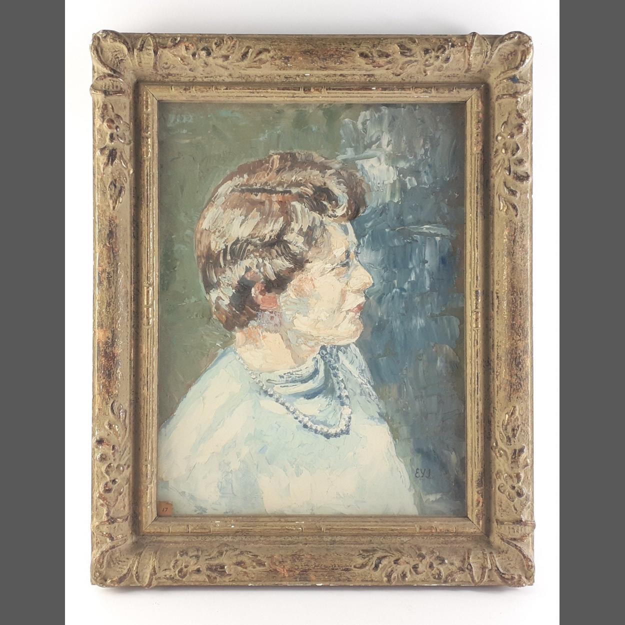 EY. JOHNSTON. Borders interest artist. Portrait of a Lady, oil on board. Heavy gilt frame, 50cm x 40cm approx.