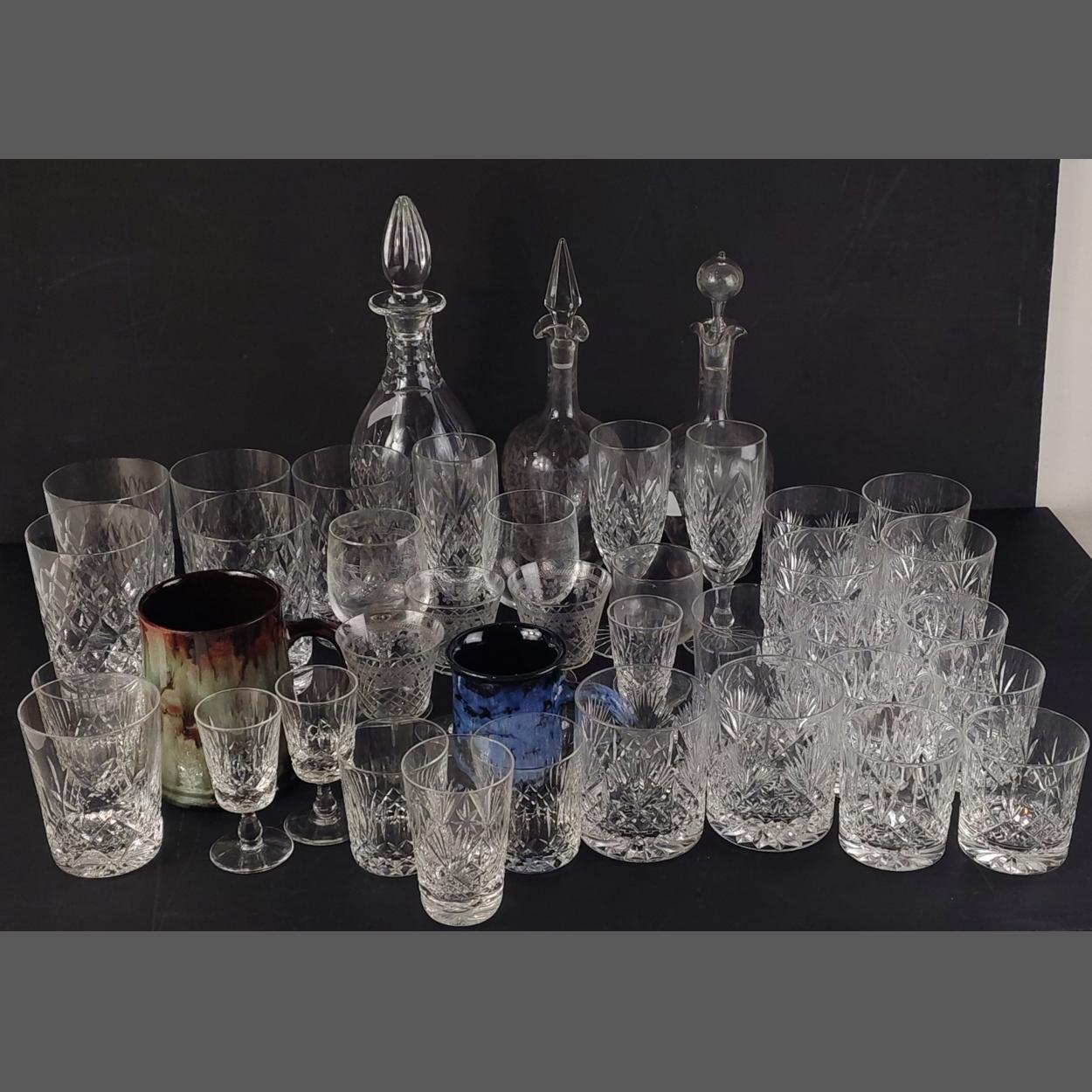 A box of good quality useful glassware to include carafe, EDINBURGH CRYSTAL stamped whisky tumblers and much else.