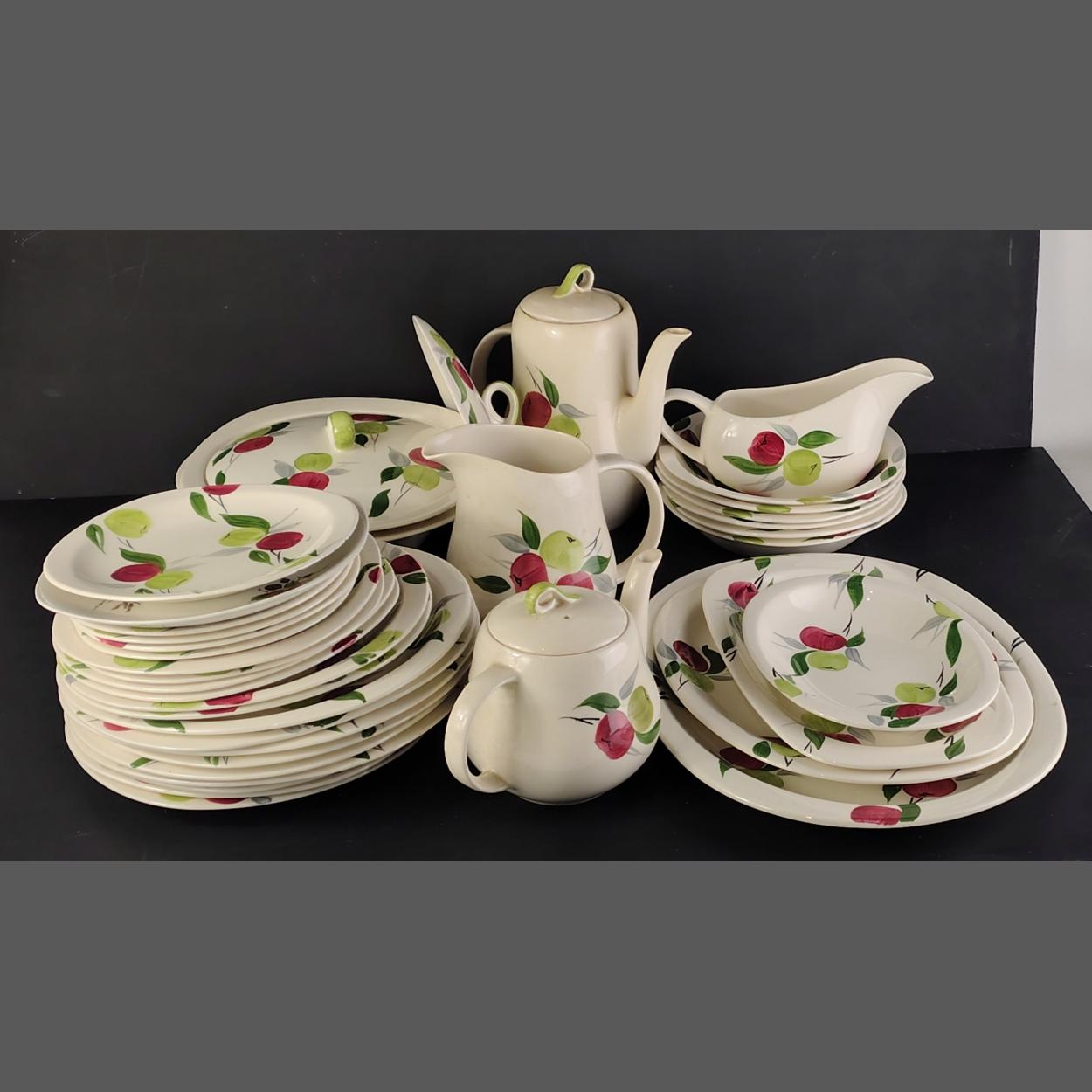 ROYAL SWAN part dinner service in lovely fruit pattern design. Comprises lidded tureen, plates, tea and coffee pots with milk and sugar. Some signs of wear but overall good useable order.