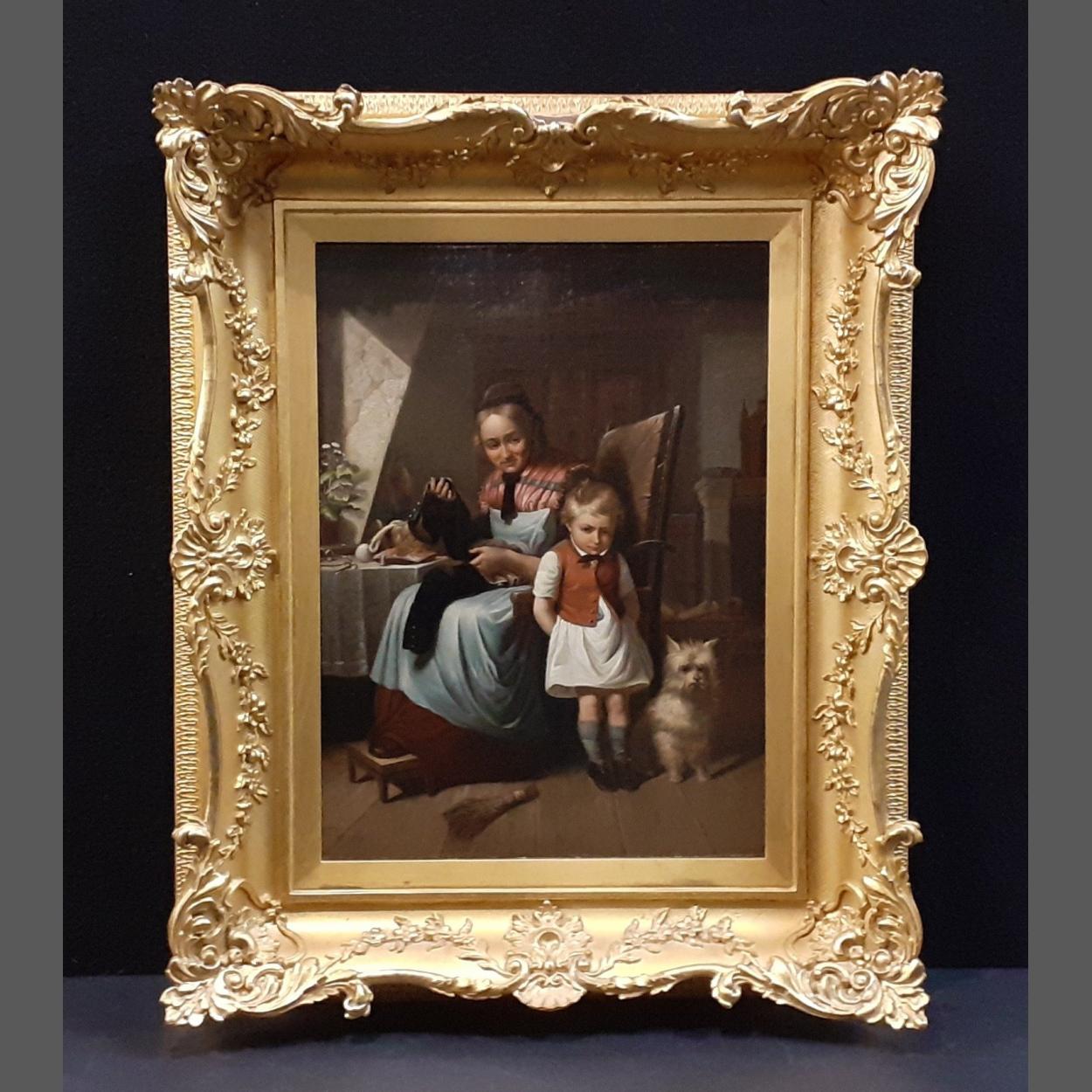 Oil on Board signed DG and dated 1879 depicting Woman and Child . Heavy ornate gilt Gesso frame. Size 66cm x 53cm approx.