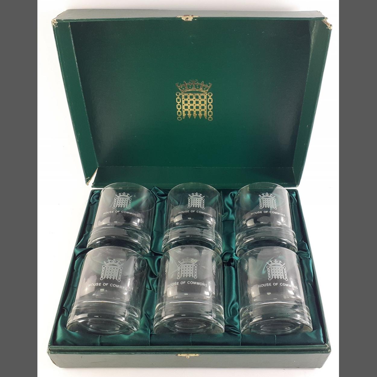 HOUSE OF COMMONS glass whisky tumbler box set of six in box.