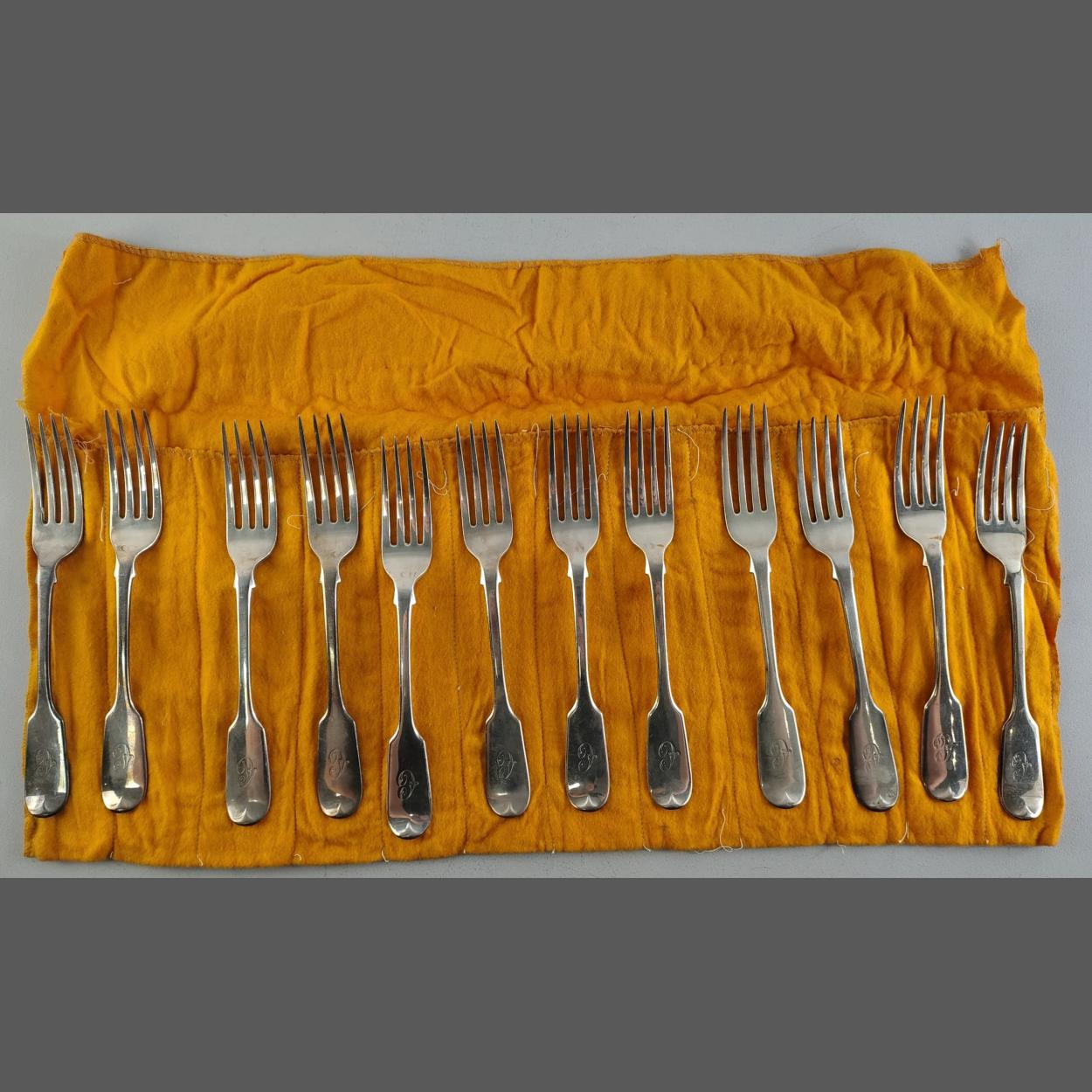 STERLING SILVER Twelve dessert forks each 18cm approx. Hallmarks for London 1860. Makers Elizabeth & John Eaton. Gross weight 569g approx