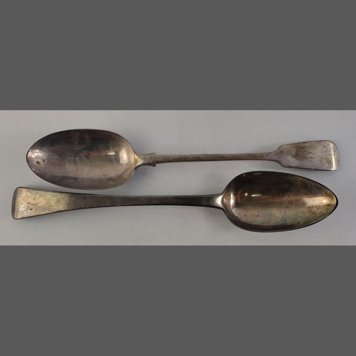 STERLING SILVER. Two large serving spoons with unmatched London hallmarks each 30cm approx. Gross weight 250g approx