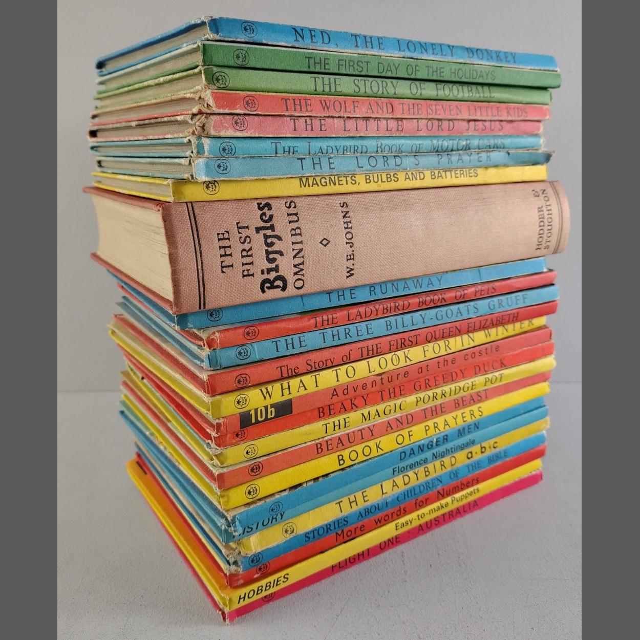 A collection of vintage LADYBIRD books to include NED THE LONELY DONKEY (series 497), THE FIRST DAY OF THE HOLIDAYS (series 401), THE LADYBIRD BOOK OF MOTOR CARS (series 584, rev ed. 1966), THE STORY OF FOOTBALL (series 606C), and many others. Also the FIRST BIGGLES OMNIBUS by WE Johns.