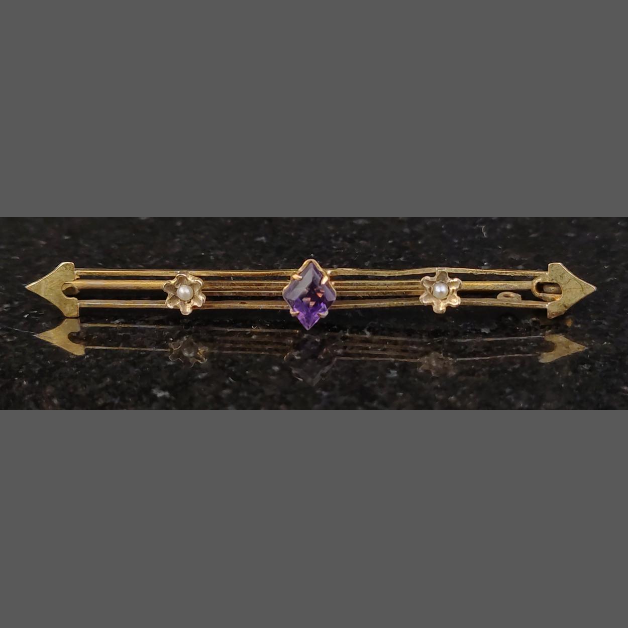 A 9ct bar brooch with central amethyst and seed pearls. Gross weight 1.45g approx
