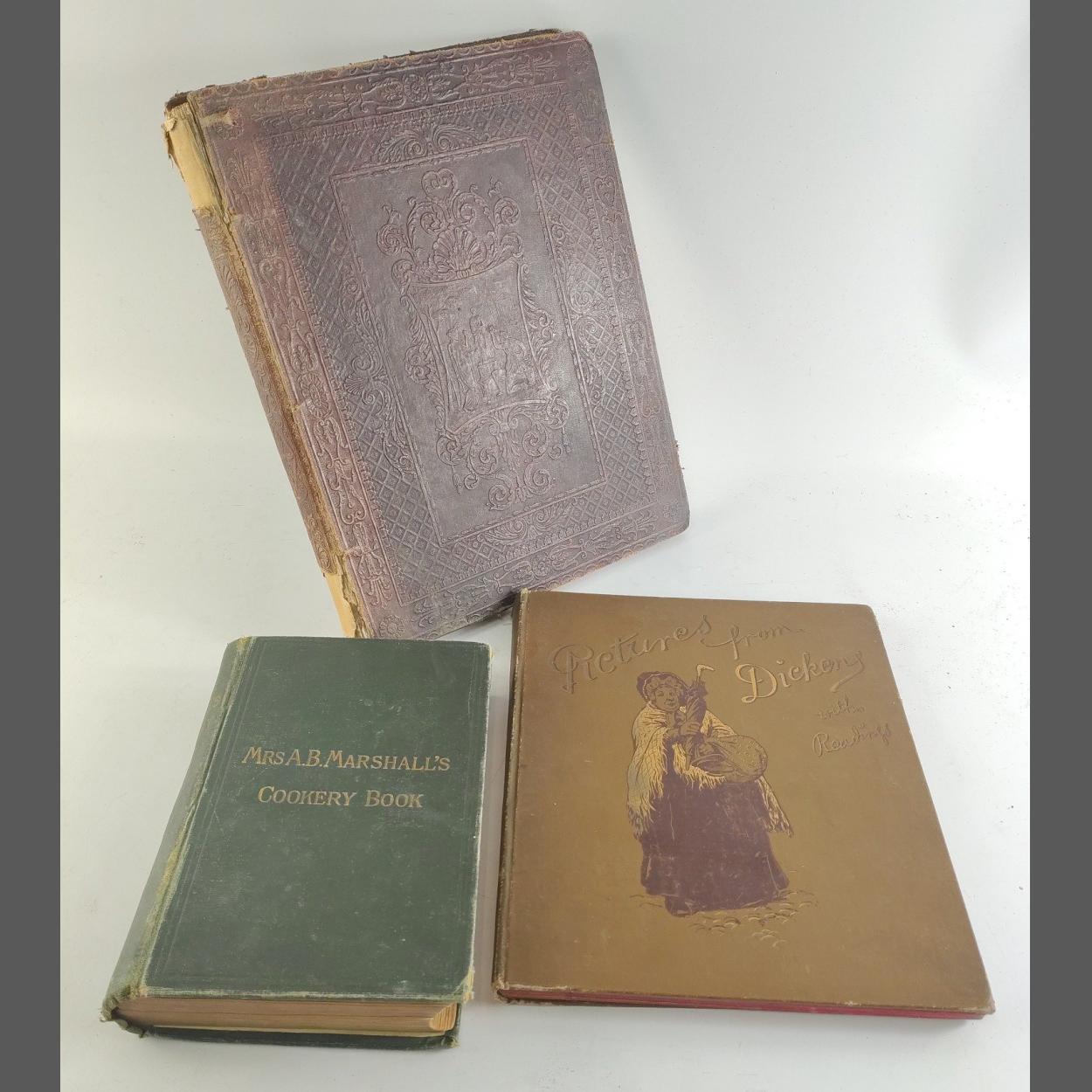 A Victorian album with red tooled leather cover with hand-written copies of letters etc from the mid-19th century. Includes a letter written by SJ Coleridge and sent to his god-child 12 days before his death. Some signs of wear but pages all attached. Also a copy of PICTURES FROM DICKENS with Readings including colour plates, printed in Bavaria. With dedication dated 1895. Also MRS A.B. MARSHAL'S COOKERY BOOK, revised edition