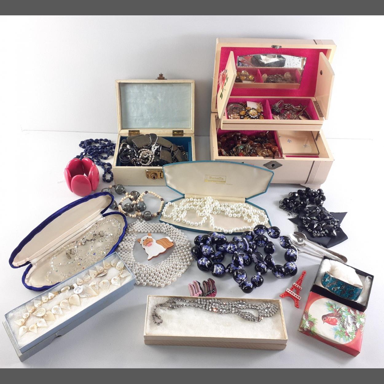 A good selection of jewellery to include musical jewellery box with beads, chains etc, a smaller jewellery box with chains, beads and a box of pearls, beads and bijouterie. Lots of interesting pieces!