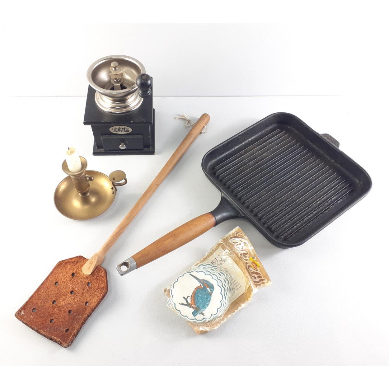 A small kitchenware lot to include a cast iron griddle pan, a CAFETIERE coffee grinder, a leather fly swat and a brass Wee Willie Winkie candle stick.