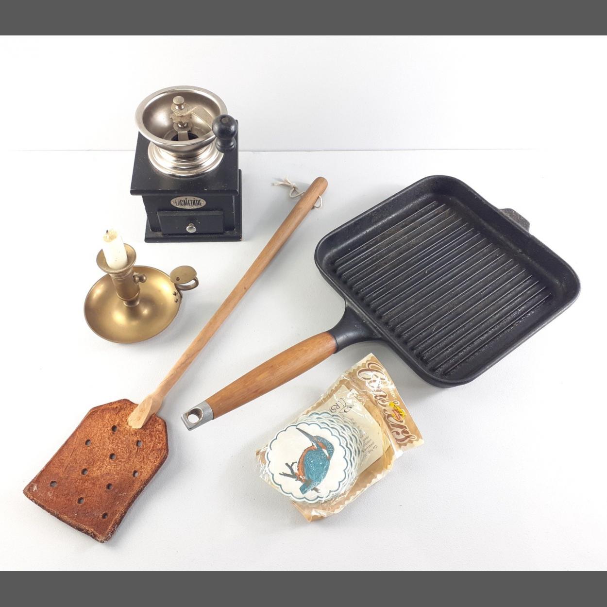 A small kitchenware lot to include a cast iron griddle pan, a CAFETIERE coffee grinder, a leather fly swat and a brass Wee Willie Winkie candle stick.