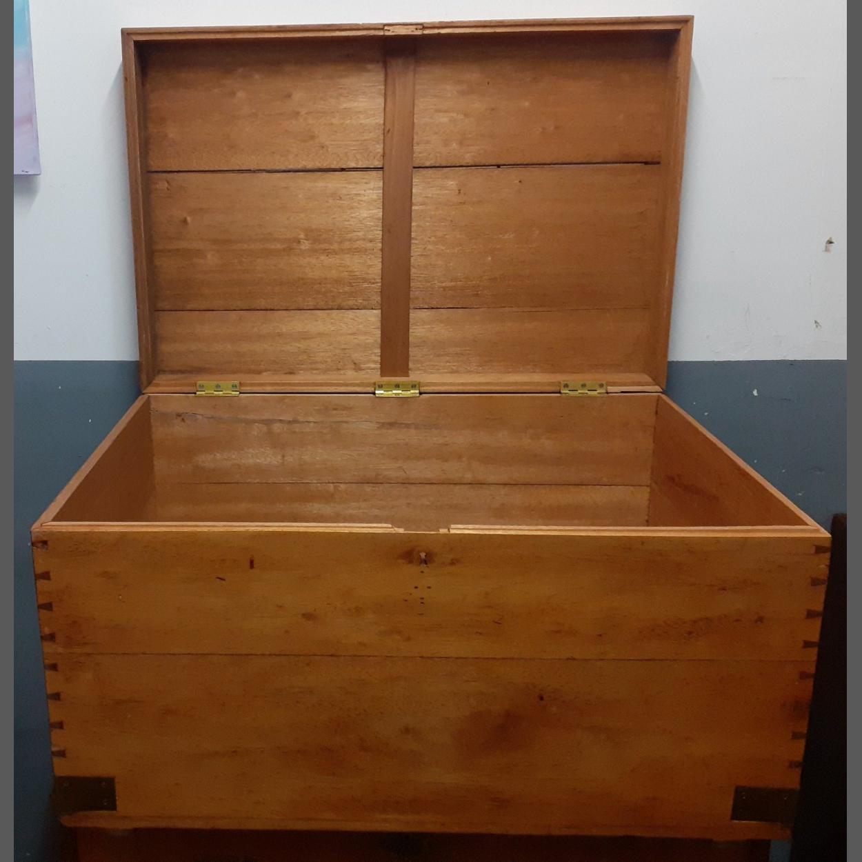 IDEAL STORAGE! - A light coloured wooden chest with brass edges and dovetail joints. Measures L91 x W61 x H48cm approx