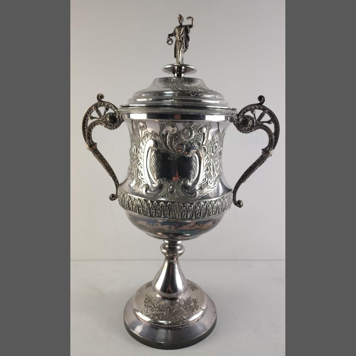 An IMPRESSIVE large lidded silver plated trophy with high decoration and beautifully sculpted finial. Clear cartouche. A superbly made piece, no makers marks. Stands 44cm tall approx.