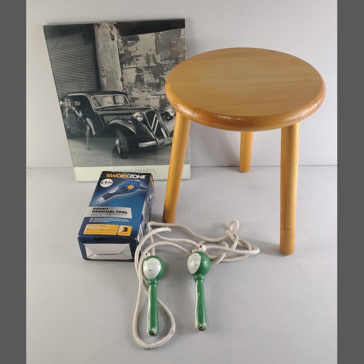 A wee box of odds, to include a super photographic print of a Citroen Traction Avant, a handy small milking stool, and a Workzone grout removal tool.