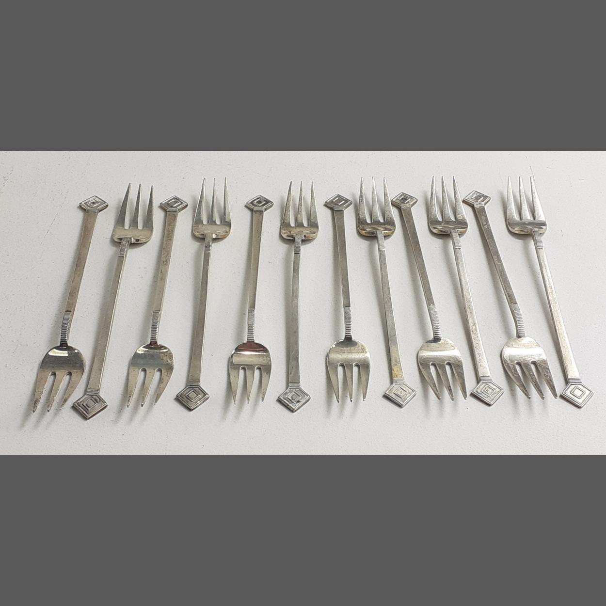 Twelve small Dutch silver forks with diamond shaped finials and indistinct marks to neck. Gross weight 85g approx.