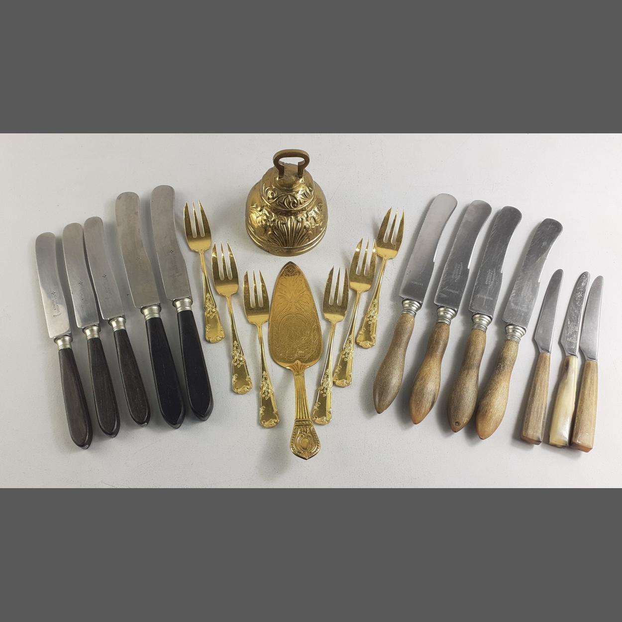 A lot of assorted stainless steel flatware with a small brass handbell.