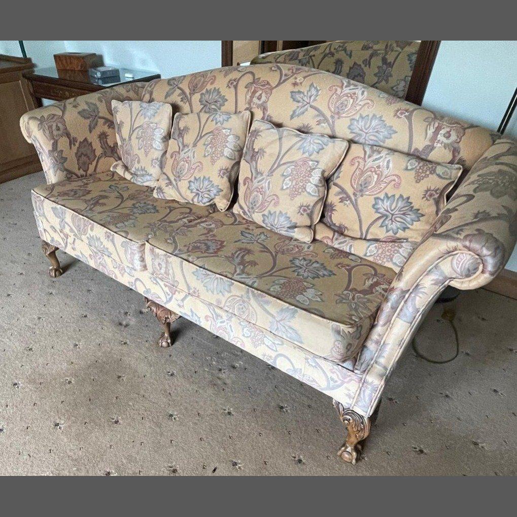 A CLASSY three piece ball and claw GEORGIAN style suite with matching cushions - comprising of a three seater couch (width 190cm x 85cm depth x height 80cm approx), a two seater couch (width 160cm x 85cm depth x 80cm height approx) and an impressive matching footstool (50cm square x 41cm height approx) - material covered in JACOBEAN style floral tapestry fabric in pale mustard base colour - in nice condition, but faded in some parts, but just looks amazing! and really comfortable!