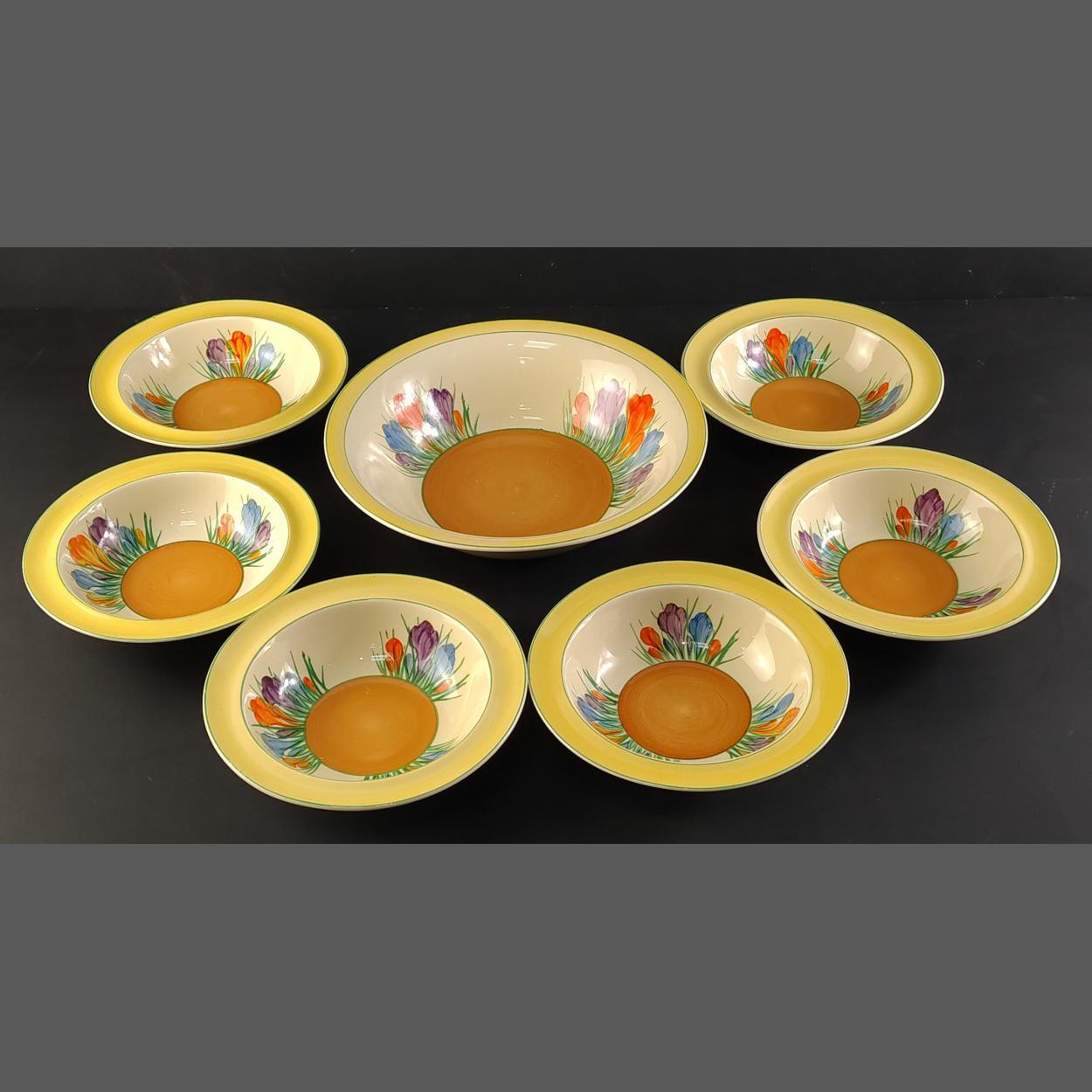 Six CLARICE CLIFF Honeyglaze crocus bowls, diameter 16cm approx and a serving bowl (22cm approx). No damage noted.