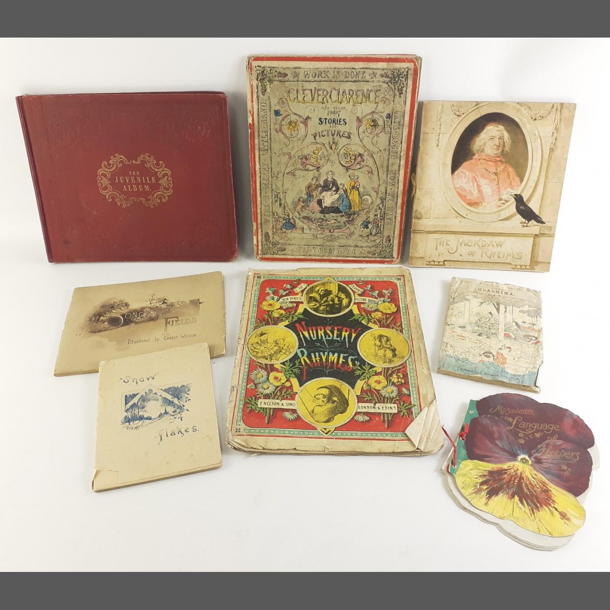 Antique children's books to include The Juvenile Album, softcover Nursery Rhymes, Clever Clarence and Other Stories, Jackdaw of REIMS, Urashima and others.