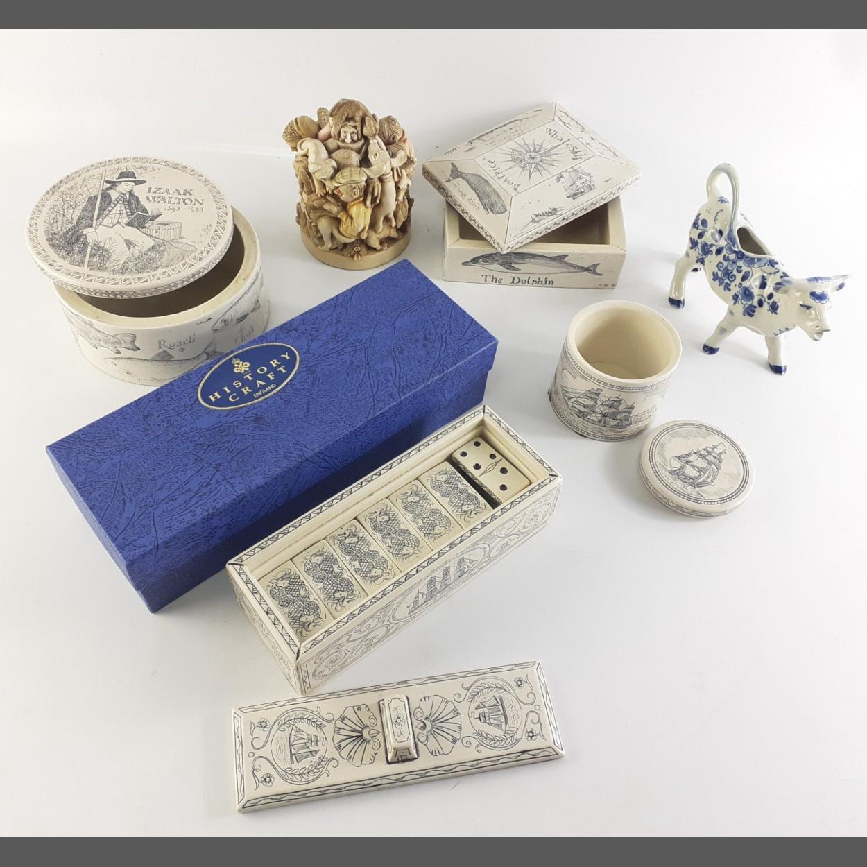 Four pieces of modern scrimshaw ware and an ANTIQUARK lidded box with dogs (12cm height approx), plus a Dutch blue and white creamer (damage to one ear)
