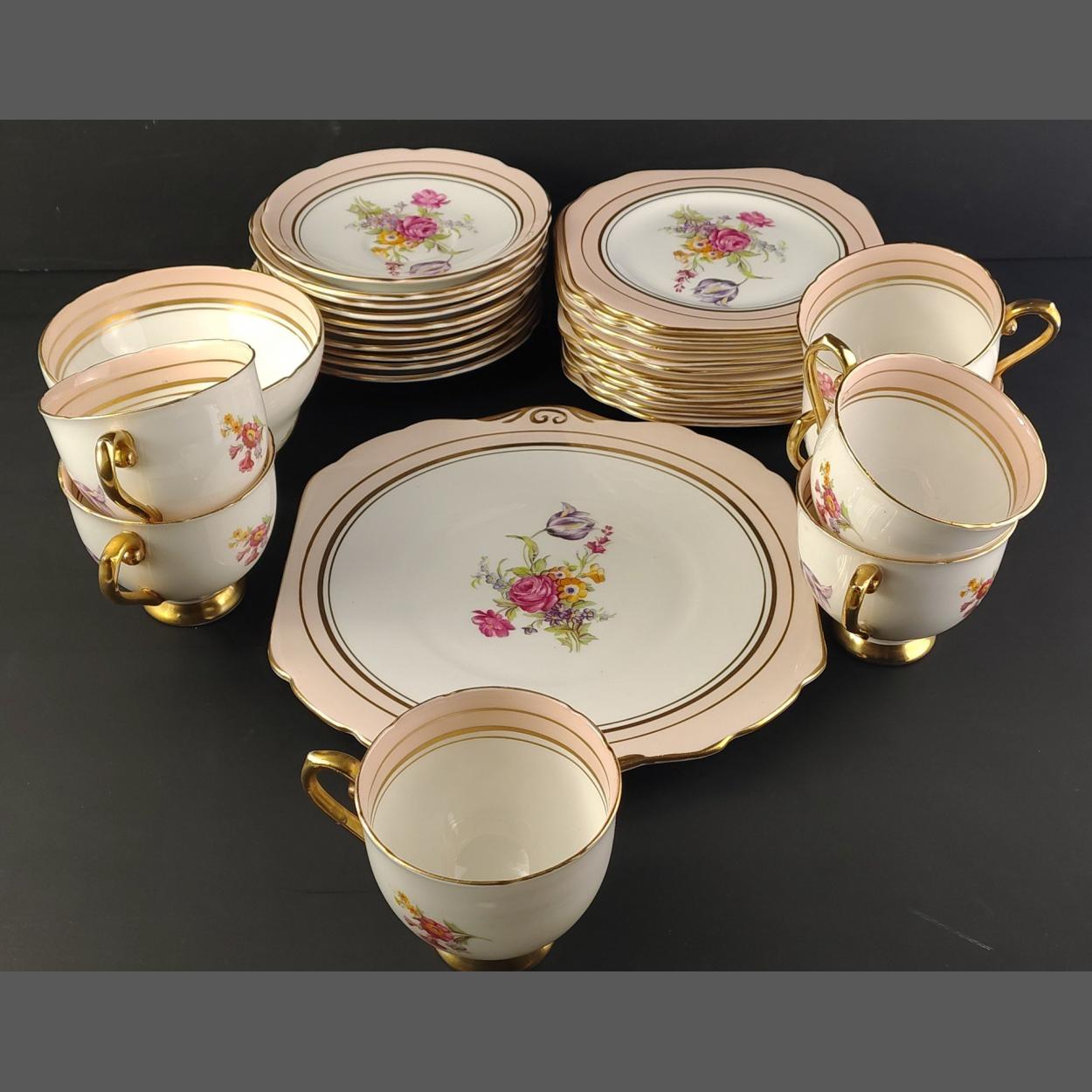 A part STANLEY fine bone china tea service comprising 7 cups, 10 saucers, 12 side plates, 1 cake plate and 1sugar bowl.