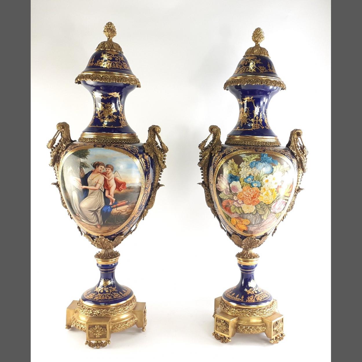 Pair of FRENCH SEVRES style porcelaine vases, with bronze caryatad head with decorative Victorian scenes - dimensions height 84cm x 29cm width approx