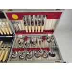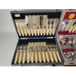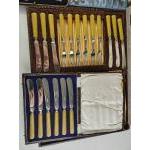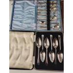 A collection of silver plated canteens of cutlery including butter knives and fruit forks, 6 butter knives, 6 teaspoons and sugar tongs, 6 grapefruit spoons, plus one other set