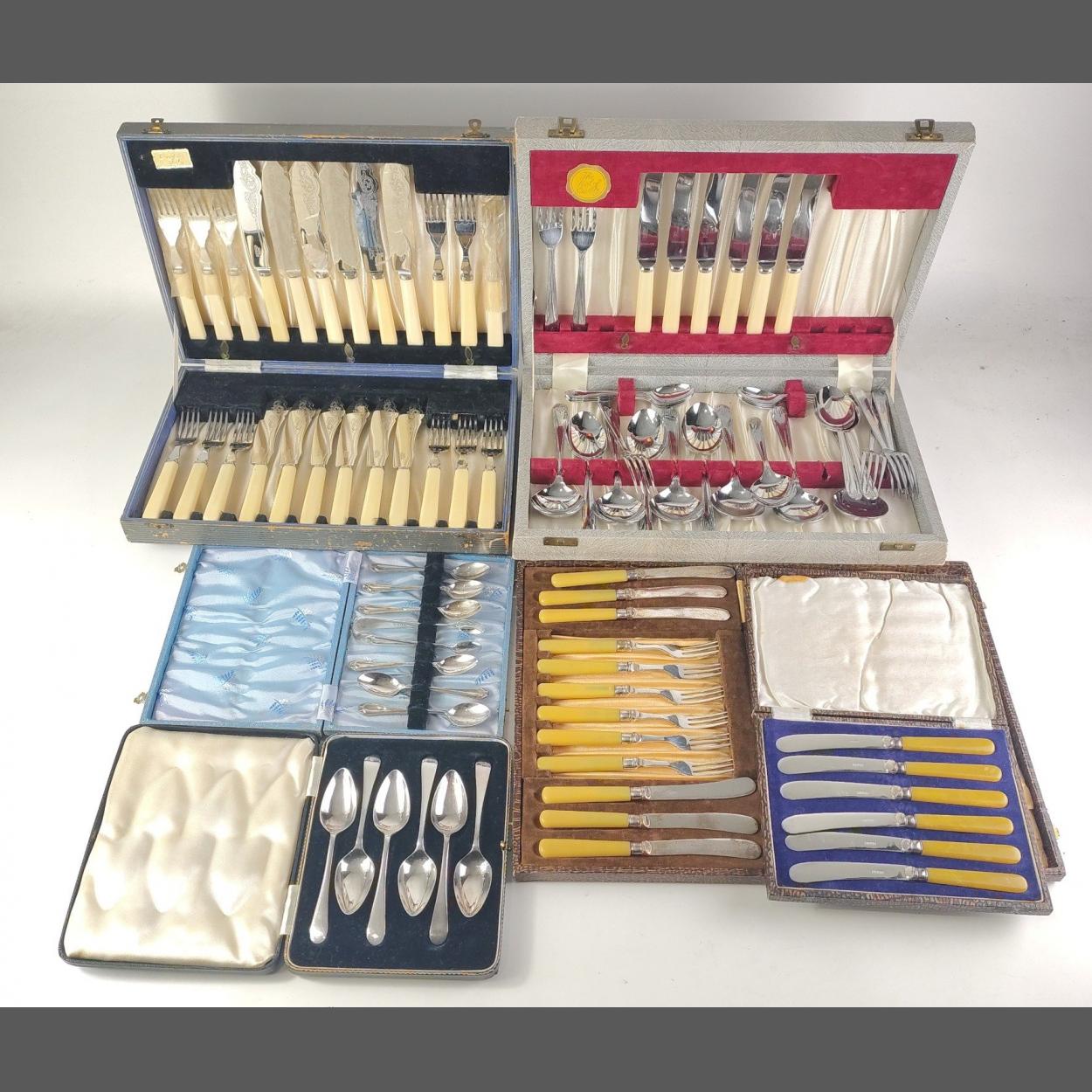 A collection of silver plated canteens of cutlery including butter knives and fruit forks, 6 butter knives, 6 teaspoons and sugar tongs, 6 grapefruit spoons, plus one other set